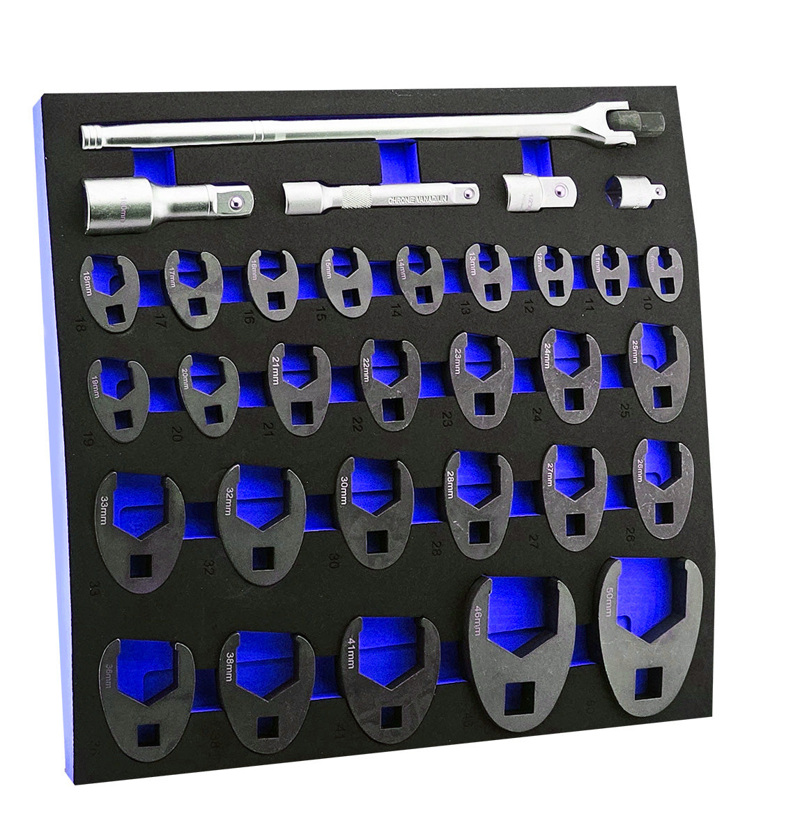 The 32pc Crow's Foot Spanner Set offers a comprehensive range of sizes designed for precise and versatile application. It includes 3/8" sizes from 10mm to 20mm, 1/2" sizes ranging from 21mm to 41mm, and 3/4" sizes at 46mm and 50mm. This set also comes with a 1/2" breaker bar (375mm length) for high torque needs, plus 1/2" and 3/4" extension bars for improved reach and accessibility. Additionally, adaptors are included for seamless compatibility between 1/2" female and 3/8" or 3/4" male connections, ensuring adaptability across multiple tool setups. Ideal for professional mechanics and technicians requiring precise torque control in tight spaces.