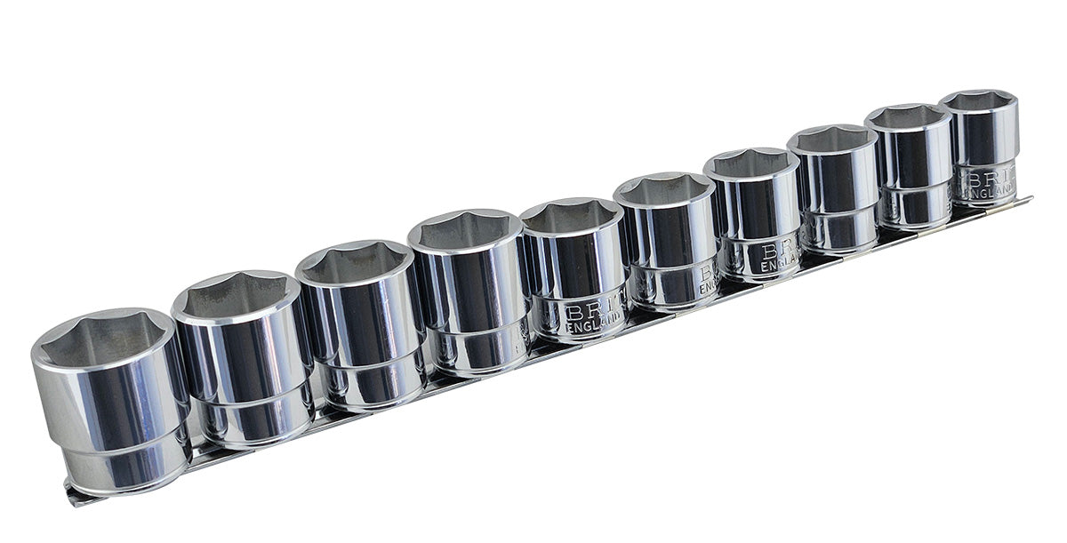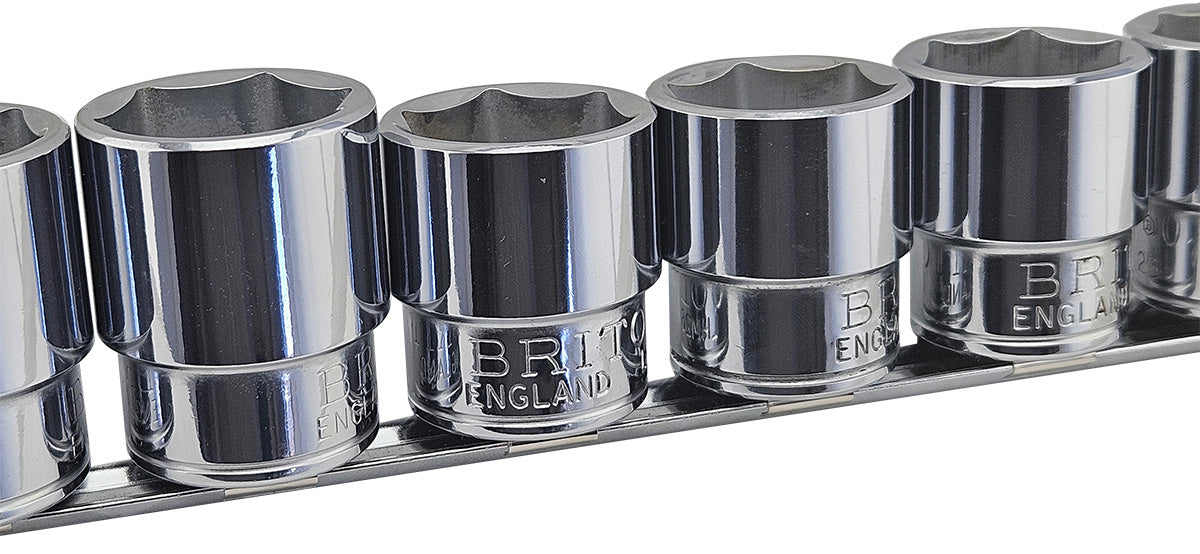 This 10 piece socket set from the Britool Hallmark range has been crafted from top-grade alloy steel. Each socket features a 6-sided hexagonal design and incorporates a ball retaining groove on each face of the square drive, providing a secure and reliable fit with all 1/2 inch accessories. Manufactured at the Britool UK factory in Cannock prior to its closure, these sockets have now become increasingly rare with some sizes now sold out.