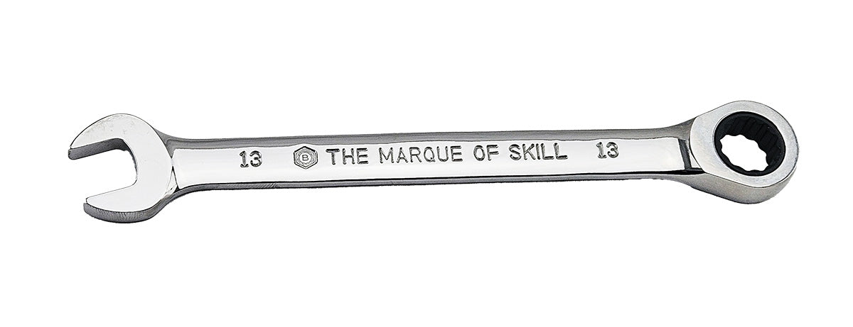 Britool’s Hallmark ratchet spanners feature a 72-tooth ratchet mechanism, allowing fastener movement with just a 5° swing, compared to the 30° needed by standard wrenches. Crafted from heat-treated Chrome Vanadium Steel, these spanners surpass international strength standards. Their corrosion resistance is enhanced by triple Nickel plating and a Chrome finish, providing a durable, polished surface. The compact head design is perfect for tight spaces and automotive work. Sizes available range from 8mm to 19mm, covering a broad range of applications.