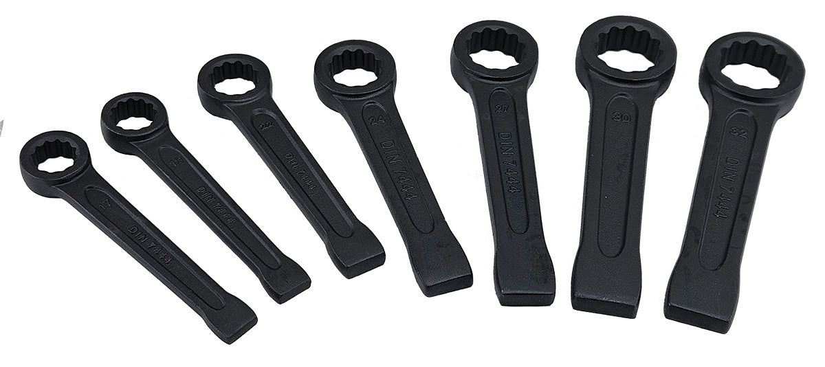 Designed for professionals who demand durability and precision, this Slogging Wrench Set covers sizes from 17mm to 32mm, including 17, 19, 22, 24, 27, 30, and 32mm wrenches. Each wrench is engineered to withstand repeated hammer strikes, ensuring reliable performance when loosening stubborn bolts and nuts. The robust construction delivers maximum impact resistance, extending the tool's lifespan under heavy-duty use. This set is essential for mechanics and tradesmen requiring strength and longevity in their wrench tools.