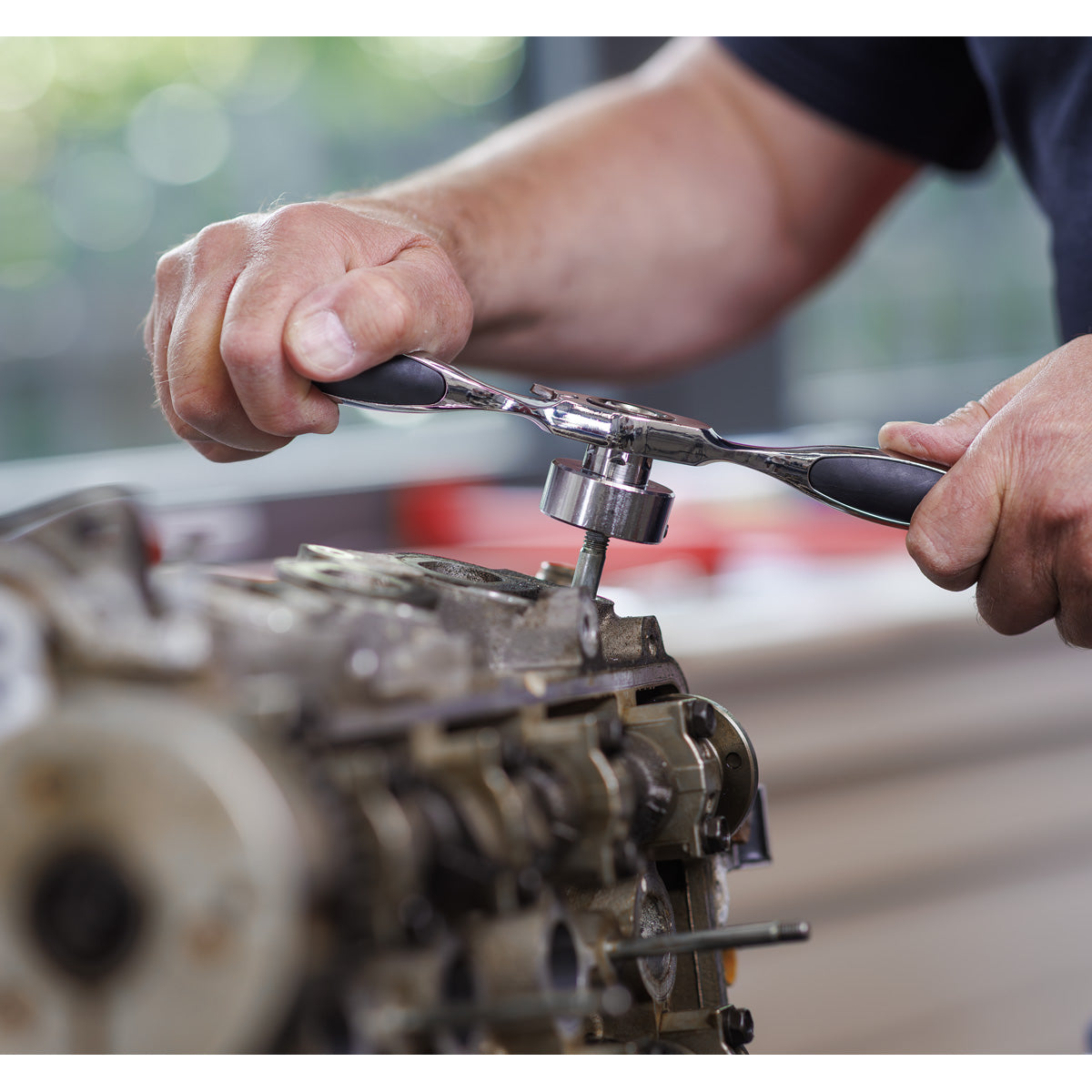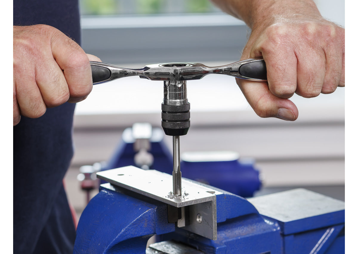 Tap and Die Holder Set with 72-tooth reversible ratchet for precise threading in tight spaces. Includes die holder (M3–M12), tap holder, 3mm hex key, and T-bar for versatility.