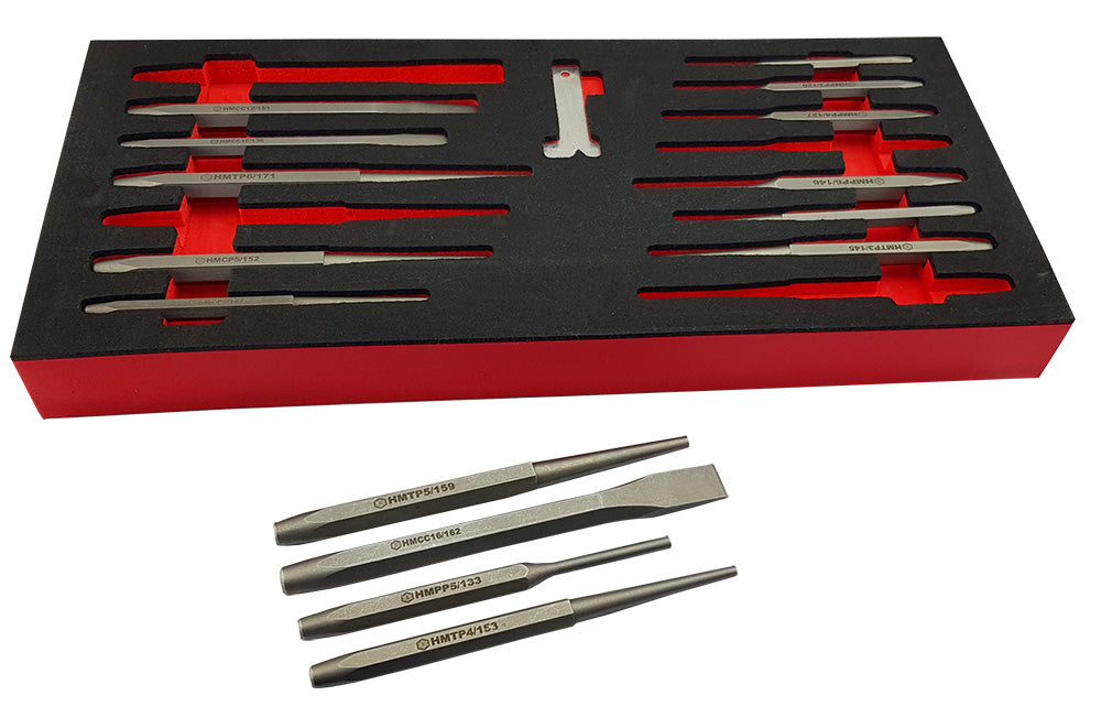 The Britool Hallmark 15 Piece Heavy Duty Punch & Chisel Set offers precision and durability for professional and workshop use. Expertly organized in a red and black EVA foam tool control tray, it ensures rapid access and secure storage, fitting neatly into toolbox tops, roll cab drawers, or tool chests. Each piece is laser engraved with the authentic Britool hallmark and part number for easy identification. The set includes cold chisels (10, 12, 16mm), centre punches (3, 5mm), pin punches (2, 3, 4, 5, 6mm), and taper punches (2, 3, 4, 5, 6mm), plus a chisel punch gauge. The foam tray measures 400mm by 182mm by 40mm, providing both protection and organisation, making this set an essential addition to any serious craftsman's toolkit.