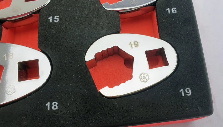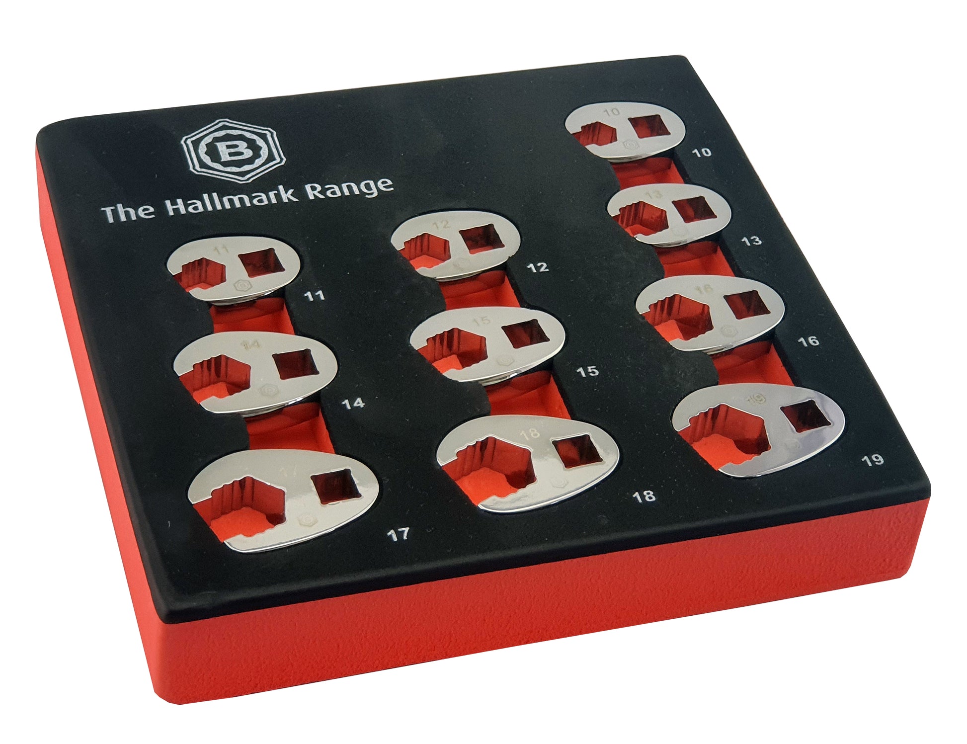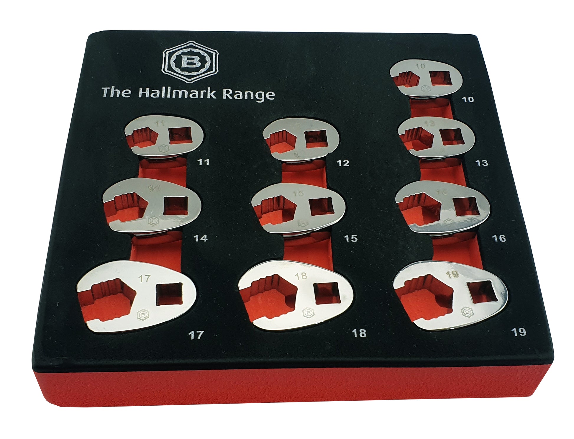 The set contains sizes: 10, 11, 12, 13, 14, 15, 16, 17, 18, 19mm and all are on a 3/8" square drive and each crow's foot is laser marked with the Hallmark logo and the part number. Individuals are available from this set if required.