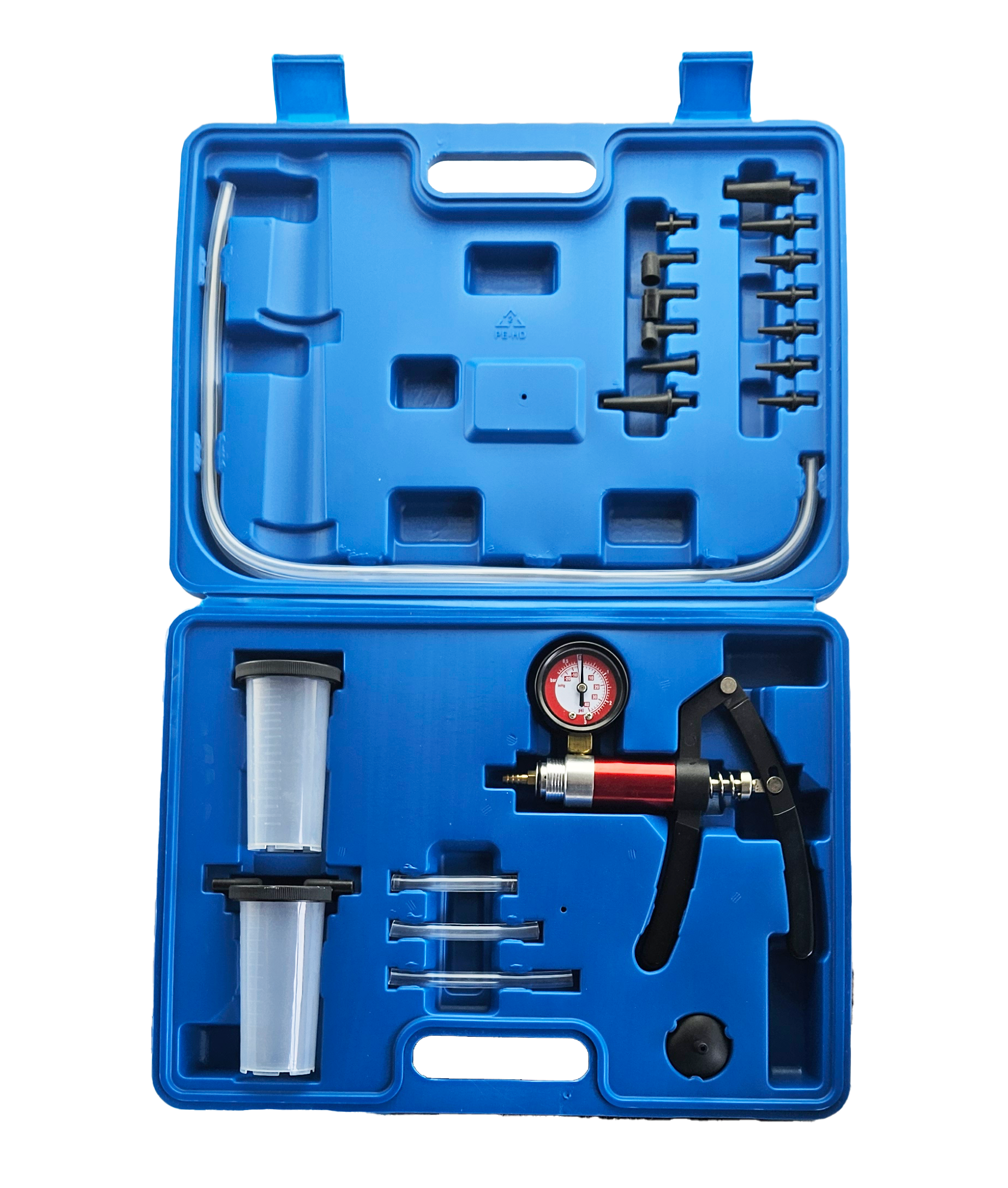 The kit includes a complete set of hoses, adaptors, and fluid reservoirs—perfect for bleeding brake and clutch systems efficiently and mess-free. The lightweight aluminium body features a simple twist function that allows easy switching between vacuum and pressure modes, making it suitable for multiple diagnostic tasks in one compact tool.