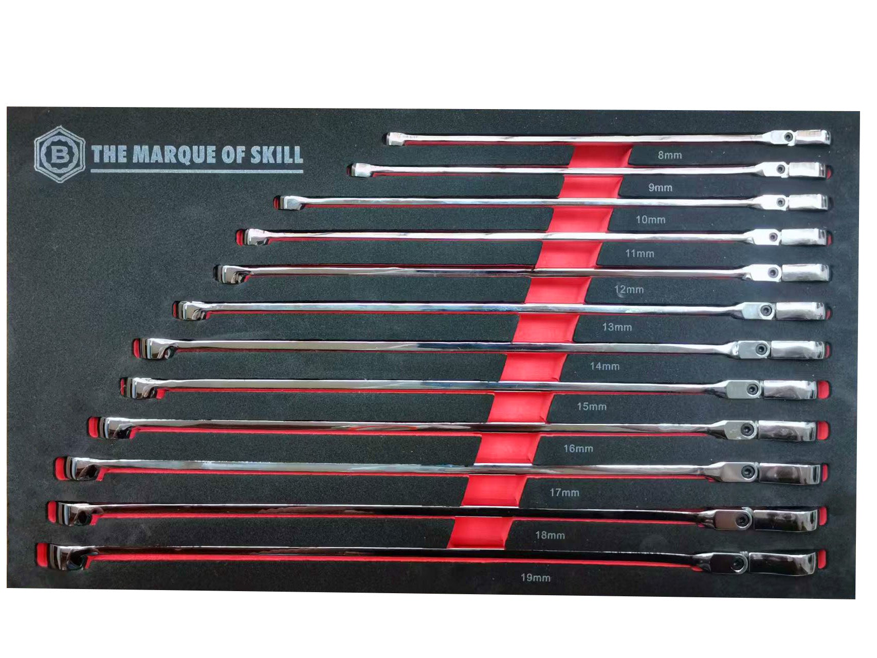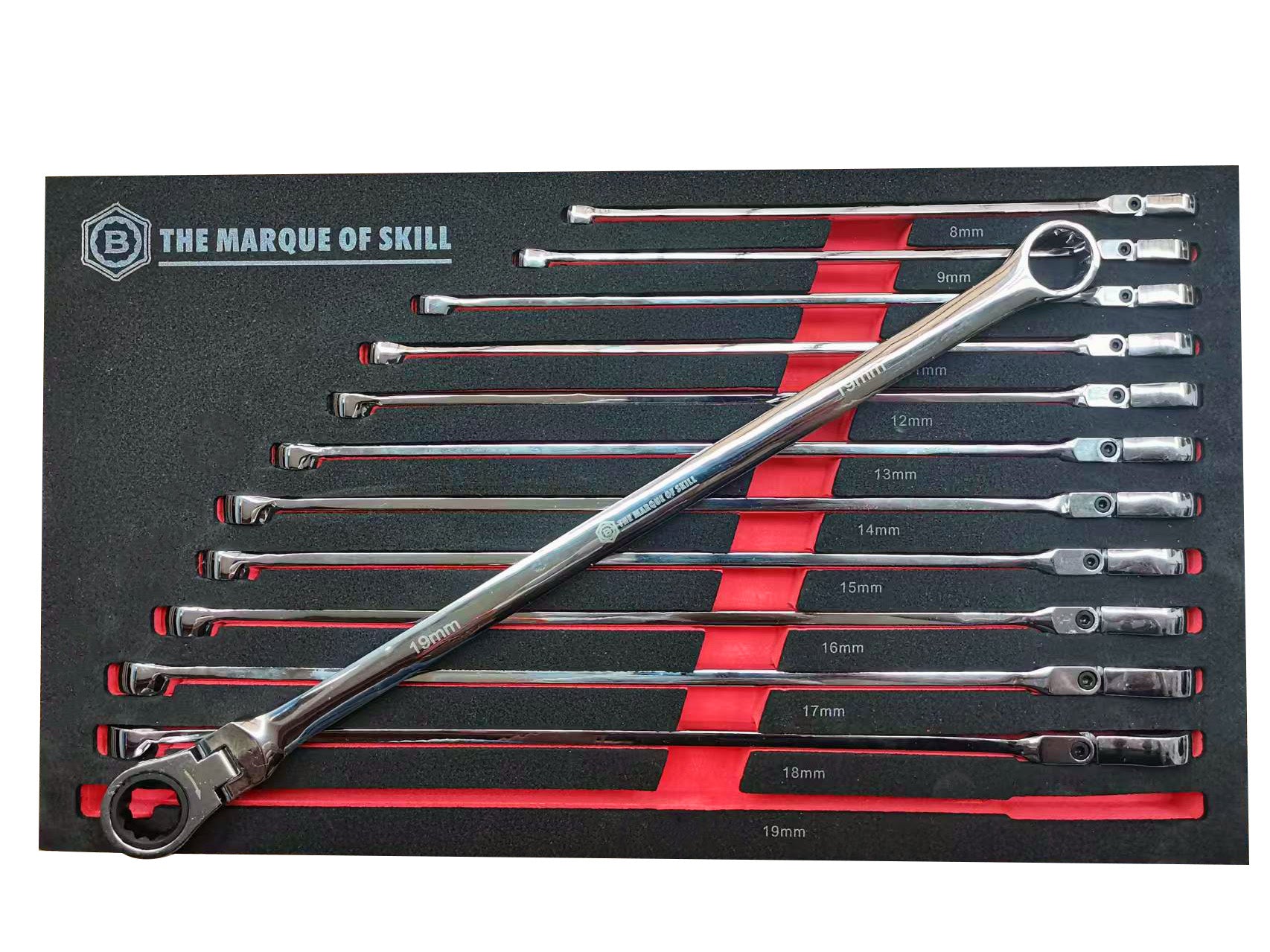 This 12 piece ratchet spanner set from the Britool Hallmark range is designed specifically for aviation, automotive engines, and work in tight spaces. The set features extra-long flat flexi-ring ratchet spanners from sizes 8 to 19mm and is supplied in a EVA storage foam.